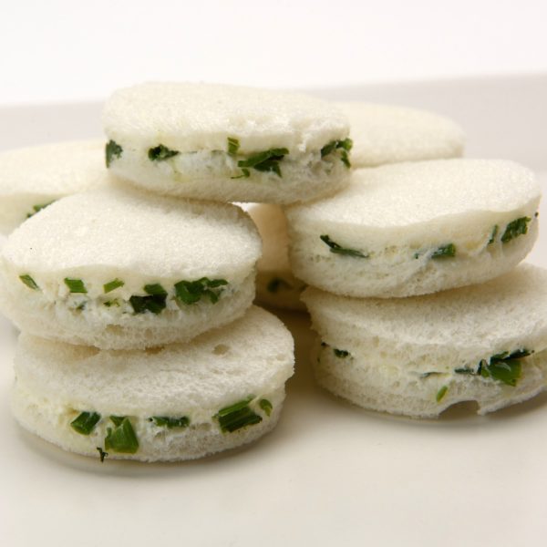 Canasta de masa brisa rellena de brunoise de pimientos y cebollitas asadas, decorada con semillas de chía.